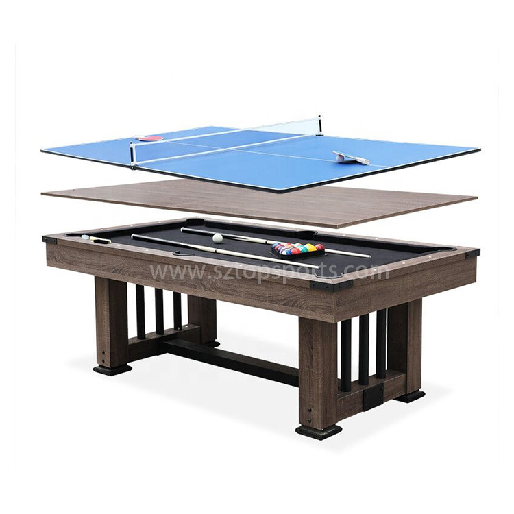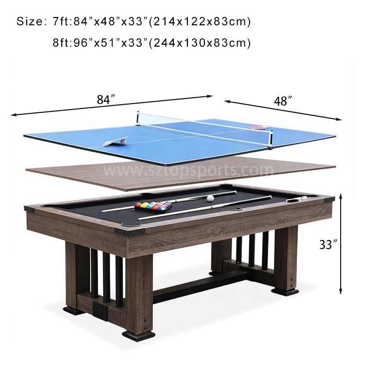 | PLAYFIELD | 18mm engineered wood with PVC lamination | ACCESSORIES | 1. Manual in English; 2. Billiard table: 1) 2 1/4″ ball set x 1 set 2) Triangle x 1 pc, 3) 57″ Cue x 2 pcs, 4) Brush x 1 pc, 5) Chalk x 2 pcs. 3. Pingpong table: two bats, net, post, balls. |