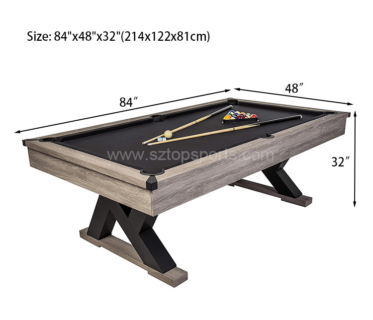 | PACKAGE METHOD | K/D, need assembly | ACCESSORIES | 1. Manual in English; 2. Billiard table: 1) 2 1/4″ ball set x 1 set 2) Triangle x 1 pc, 3) 57″ Cue x 2 pcs, 4) Brush x 1 pc, 5) Chalk x 2 pcs. |