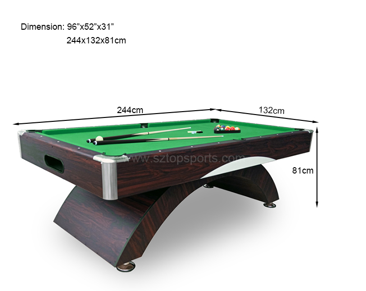 | PACKAGE METHOD | K/D, need assembly | ACCESSORIES | 1. Manual in English; 2. Billiard table: 1) 2 1/4″ ball set x 1 set 2) Triangle x 1 pc, 3) 57″ Cue x 2 pcs, 4) Brush x 1 pc, 5) Chalk x 2 pcs. |