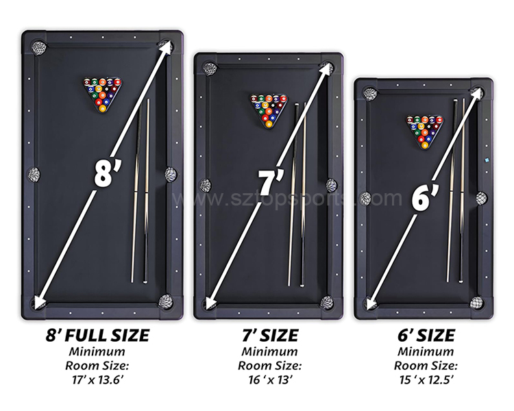 • RECOMMENDED ROOM SIZE: 13.6 ft x 17 ft minimum room size is recommended; Players can also use shorter cues (not included) for slightly smaller rooms