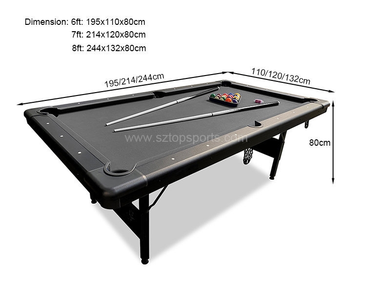 | PLAYFIELD | MDF with PVC coating | ACCESSORIES | 1. English Manual 2. Billiard table: 1) 2 1/4″ ball set x 1 set 2) Triangle x 1 pc, 3) 57″ Cue x 2 pcs, 4) Brush x 1 pc, 5) Chalk x 2 pcs, |
