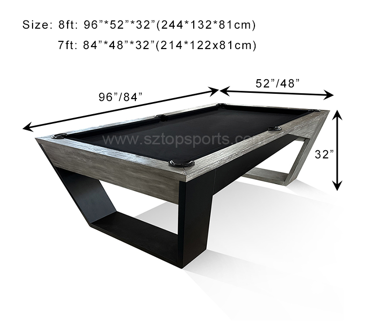 - POOL TABLE: Mixed color table body with two felt colors available(black, grey). The weight: 260 pounds Dimensions: 96″ length x 52″ width x 32″ height Pocket diameter: regular size;