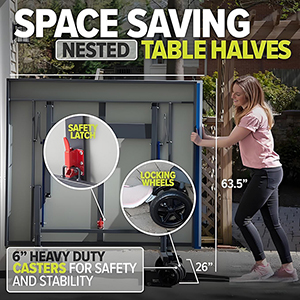 | Compact and Mobile Two separable folding halves make the table compact and easy to store. Store the table in tight spaces by combining the nesting halves and wheeling the table to your desired location. Each table half has four caster wheels and locking devices ensuring optimal safety and stability during transport and during play. Separate halves are not only a space saver, but also make it easier to move the table by easing the burden of weight of a whole table. | Adjustable Leg Levelers Each leg features adjustable height levelers that are necessary when playing on any uneven surface/terrain. | Automatic Anti-Tilt Locking Devices Double anti-tilt locking devices automatically lock on each half when the table is folded. This provides easy and safe storage and transport. To unlock simply press the lever and the table begins to automatically unfold. |
